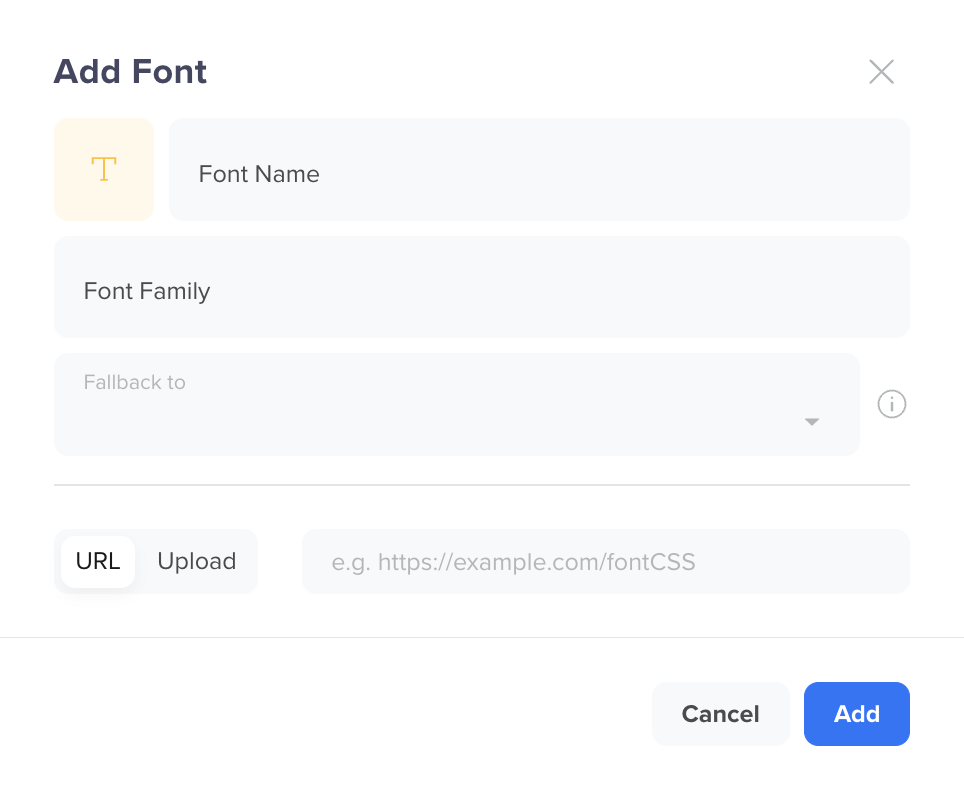 - Click the Add button to add your new Custom Font. You can either upload a CSS file containing your Custom Font or use the URL of an already hosted file.