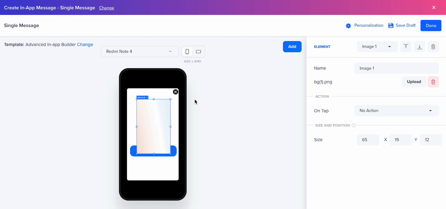 - Canvas (Left Side): The canvas is where you design your In-App message. It is fully interactive, allowing you to drag and drop elements and adjust their position and size with ease.