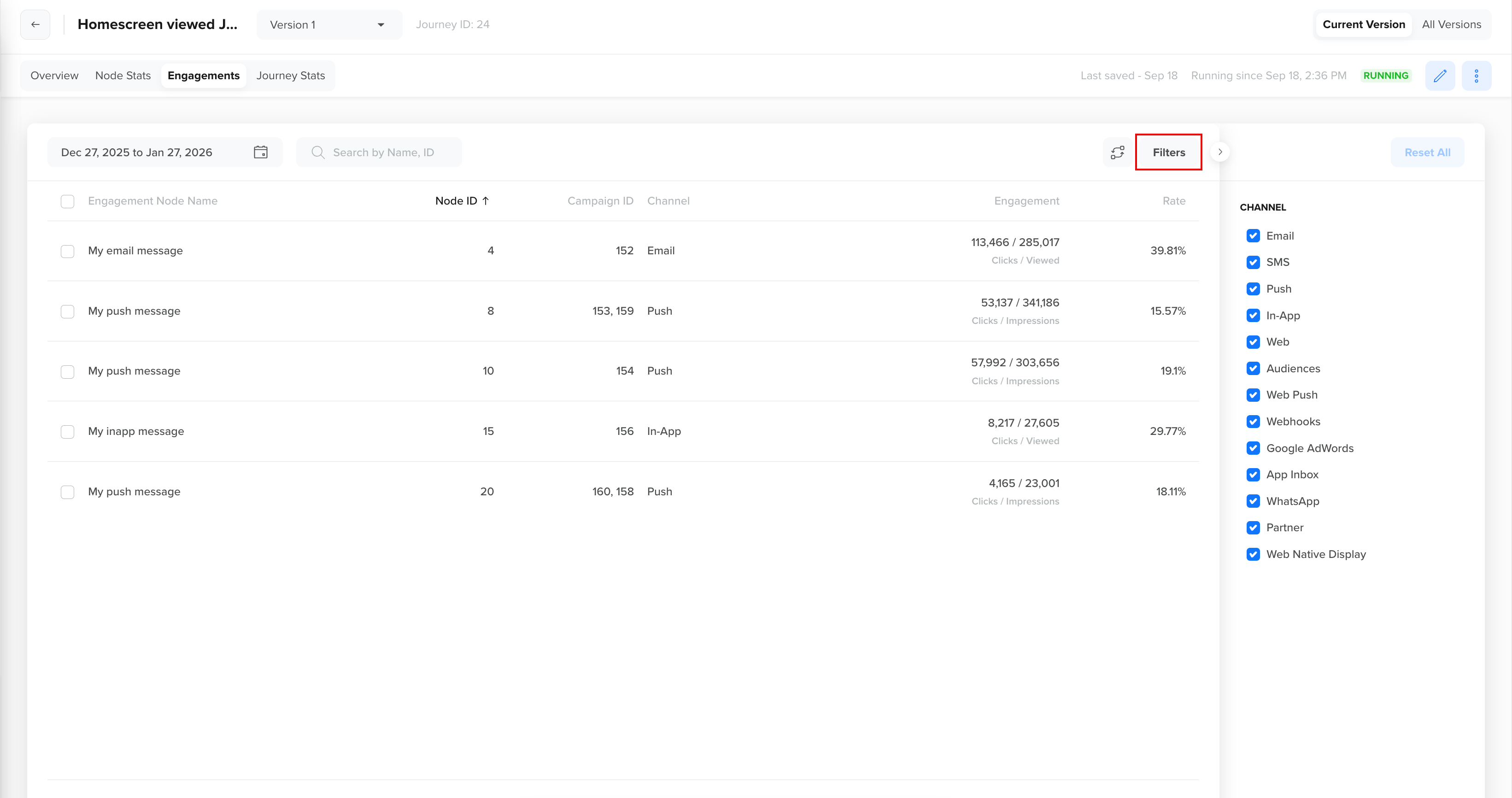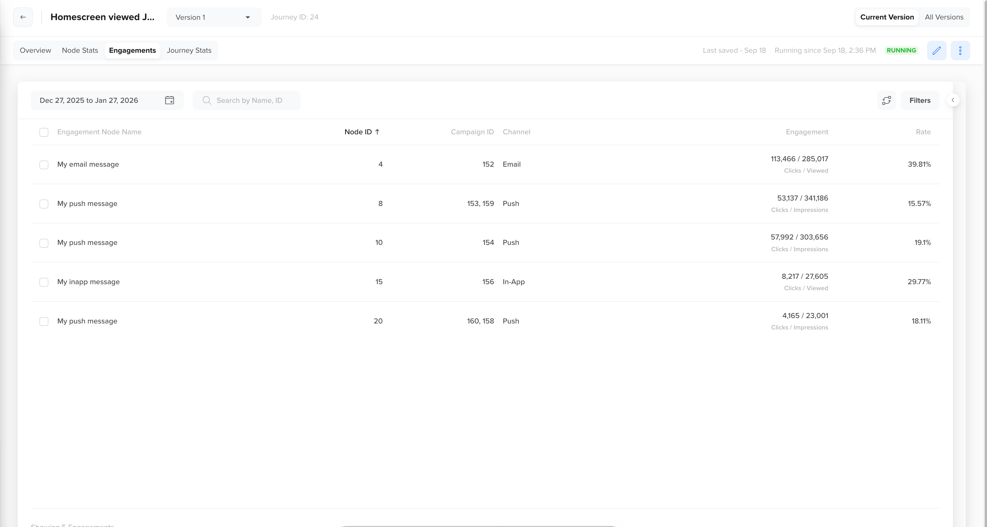 Engagement Stats provide a unified view of how each messaging node performs across all versions of a journey, helping marketers make data-driven decisions.