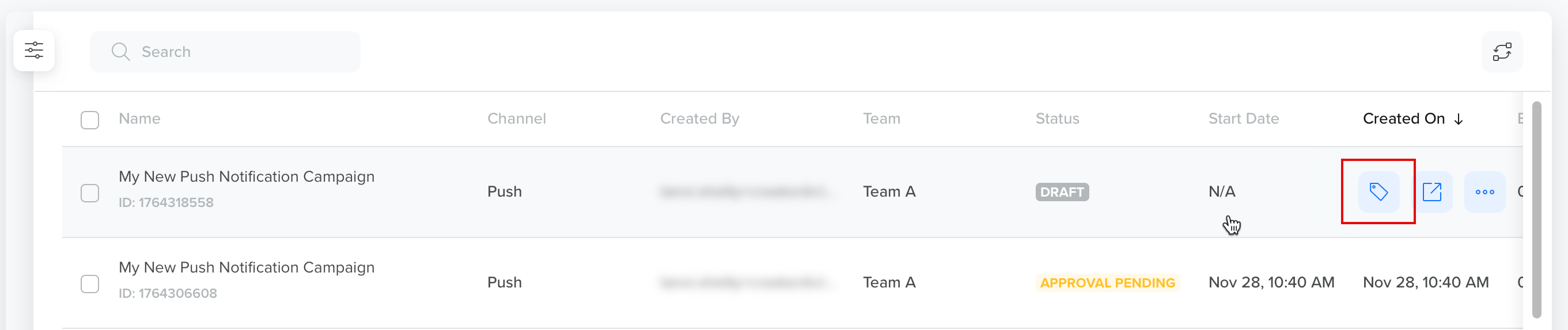 You can use filters to quickly search your campaigns by Status, Channel, Time Period, creator, and more. To do so: