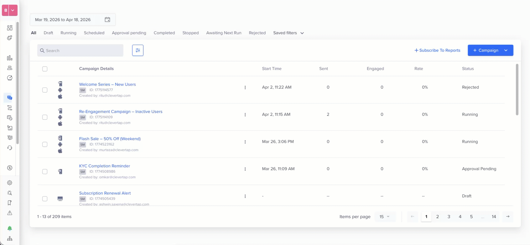 - Created by: Filters based on the email ID of the person who created the campaign.