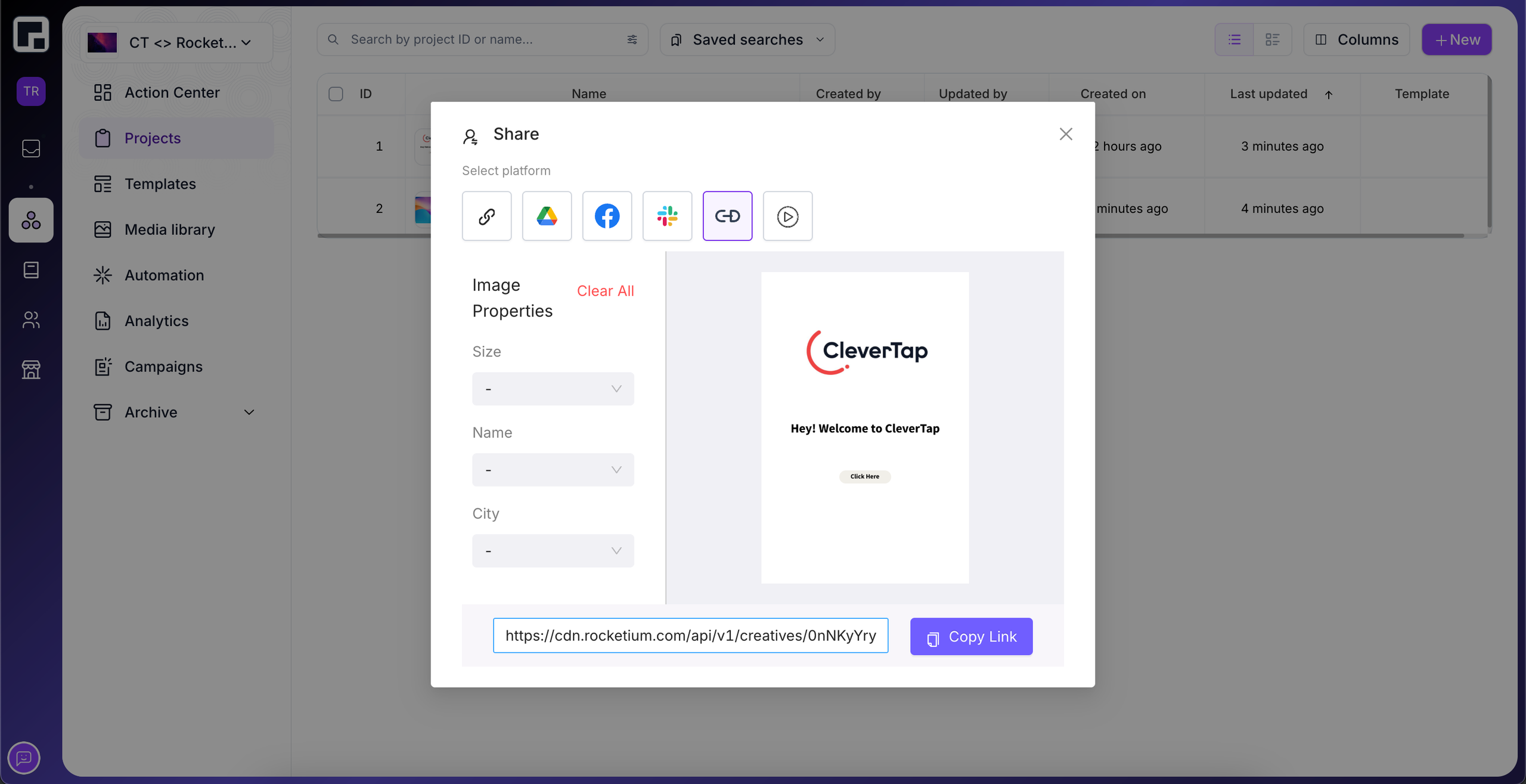 - Embed static or personalized dynamic creatives from your Rocketium dashboard into CleverTap campaigns