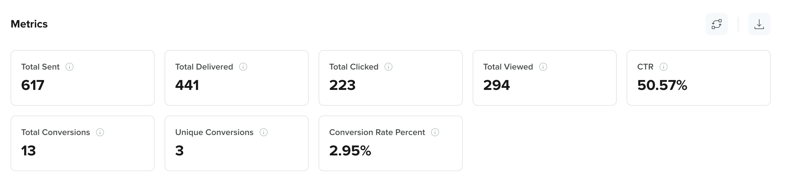 Total Delivered: The total number of messages successfully delivered to users’ devices or inboxes. For Push Notifications, the delivered count includes push impressions.