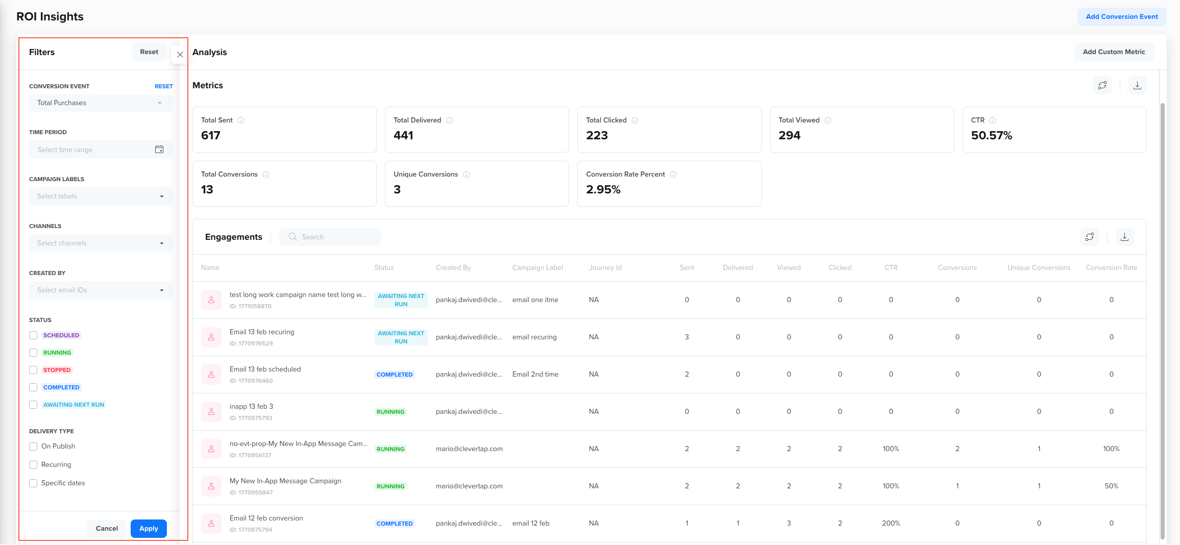 Filters help you narrow down the ROI analysis to specific campaigns, channels, time periods, or owners. When you apply filters, both the metric tiles and the engagement performance table update dynamically to reflect only the data that matches your selected criteria.
