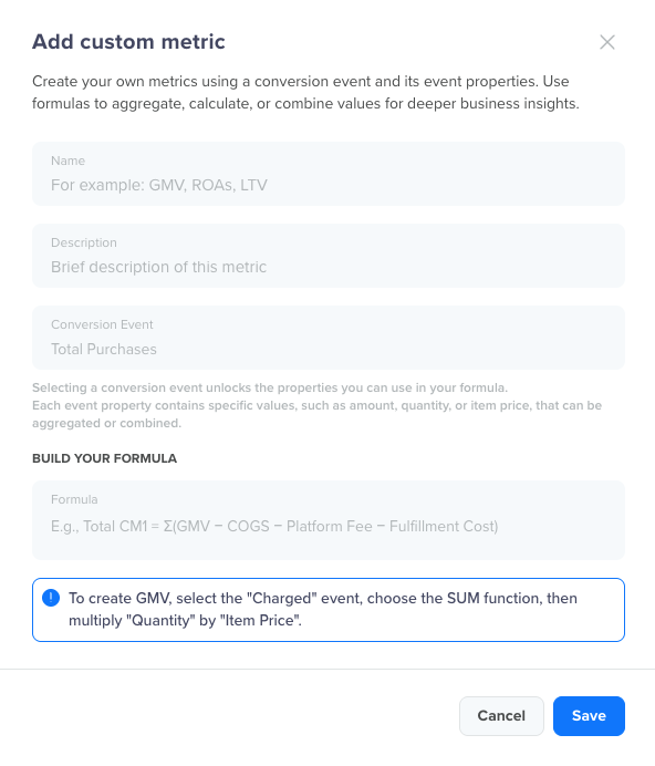 Click Add Custom Metric in the top-right corner of the ROI dashboard.