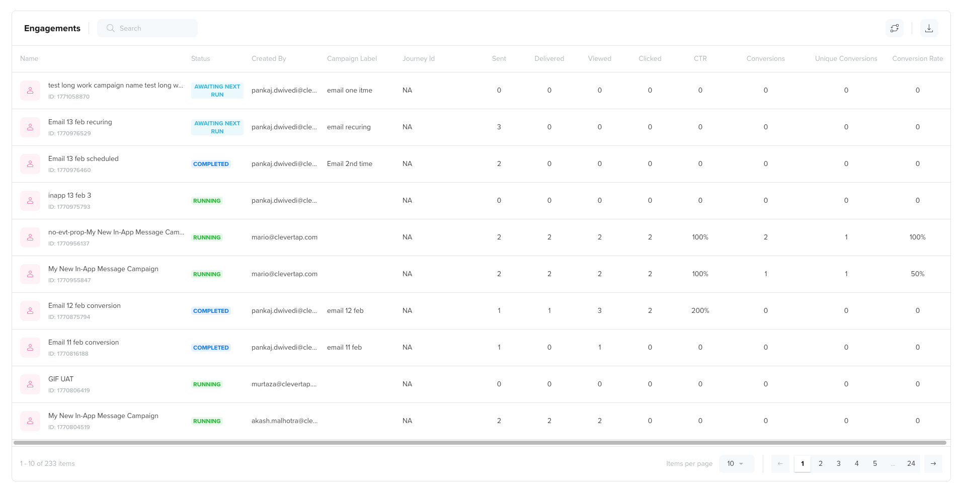 The engagement table displays campaign-level performance metrics. This table allows you to identify top-performing and underperforming campaigns at a glance.