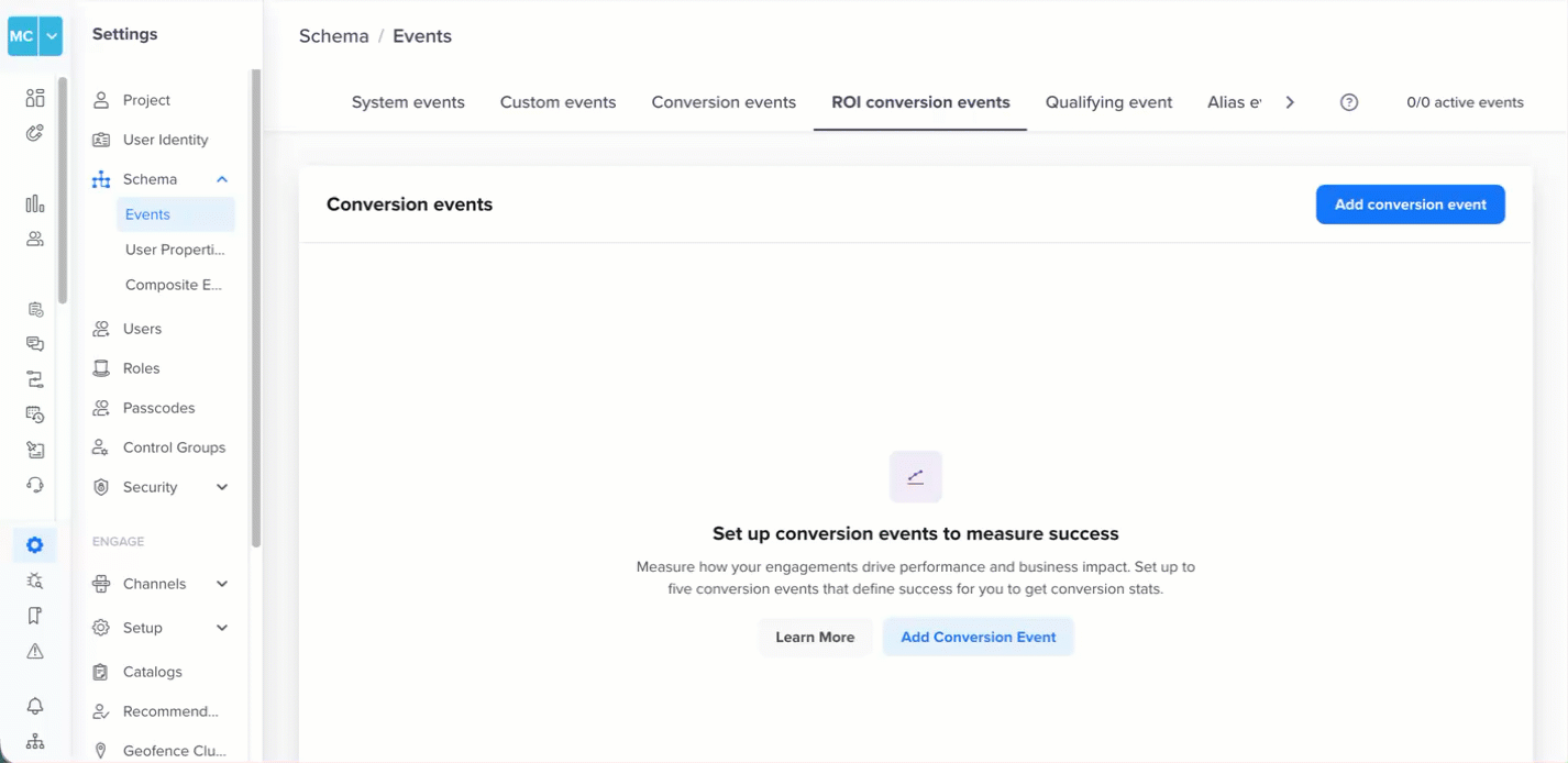 Before using ROI Insights, you must configure at least one global conversion event in the Schema. These conversion events apply across all campaigns and journeys and are used as the basis for attribution and ROI calculation.