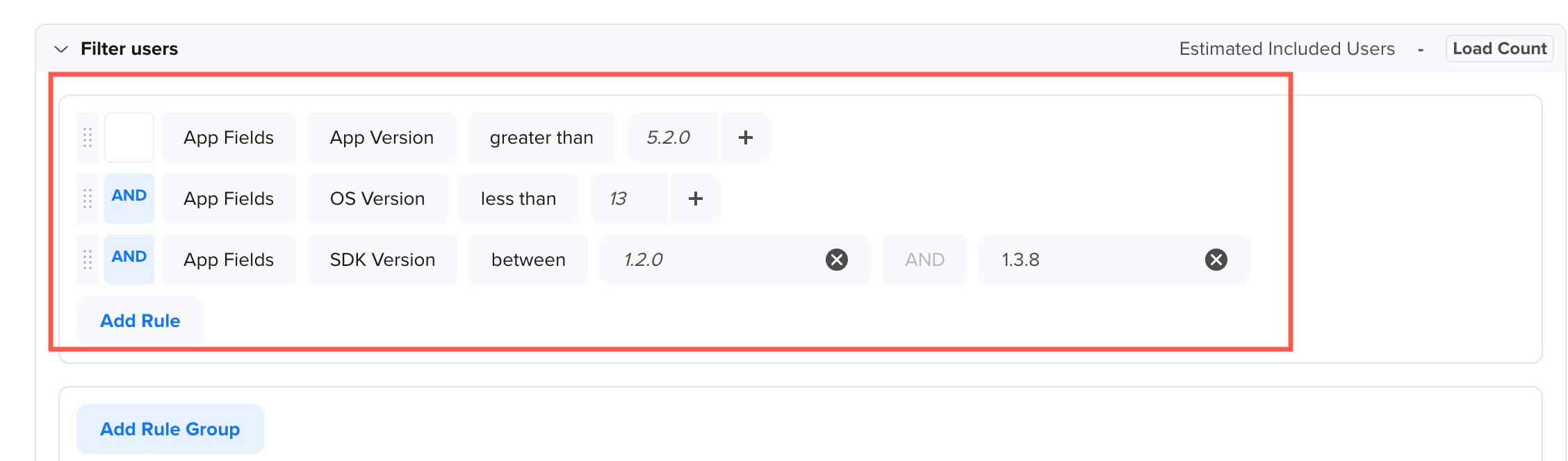 For instance, you can target users with an app version greater than 5.2.0, those on an OS version less than 13, and those on an SDK version between 1.2.0 and 1.3.8.